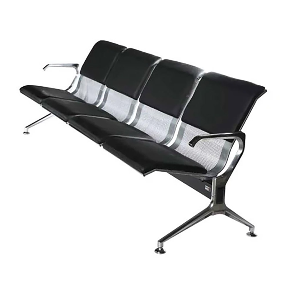 صندلی فرودگاهی چهار نفره از جنس بدنه ی فلزی ساخته شده است . اتصالات قوی که در صندلی انتظار چهار نفره فلزی به کار برده شده است باعث تامین استحکام لازم می شود که از خرابی و شکستن آن جلوگیری می کند. نشیمن و تکیه گاه این صندلی انتظار فلزی به صورت مشبک و توری است که دارای تشک نرم با روکش چرمی بوده که راحتی آنرا هرچه بیشتر کرده است.