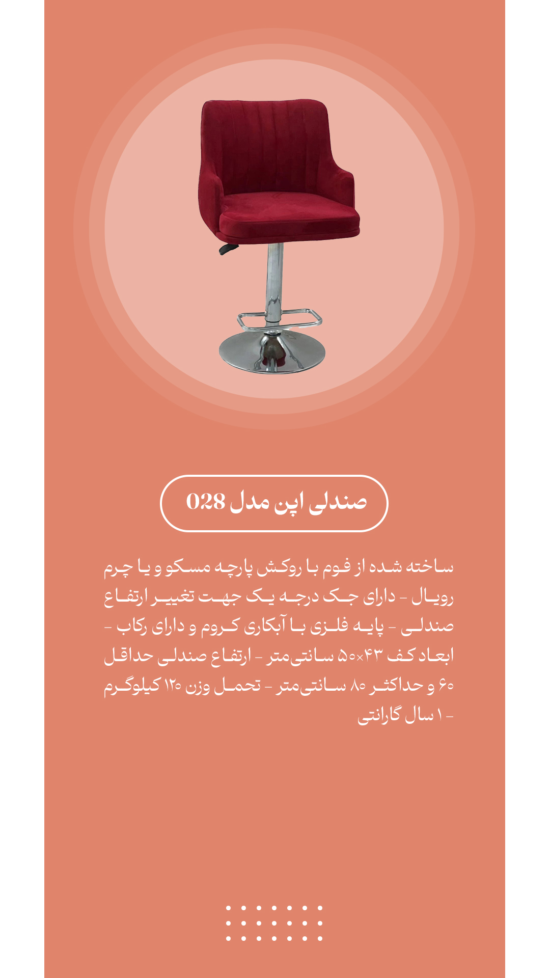 صندلی اپن مدل 028 مناسب صندلی کانتر، جزیره و آشپزخانه دارای جک استارلوبوس جهت تنظیم ارتفاع با روکش پارچه مسکو و چرم رویال مناسب جهت غذاخوری و کافی شاپ و رستوران می‌باشد.