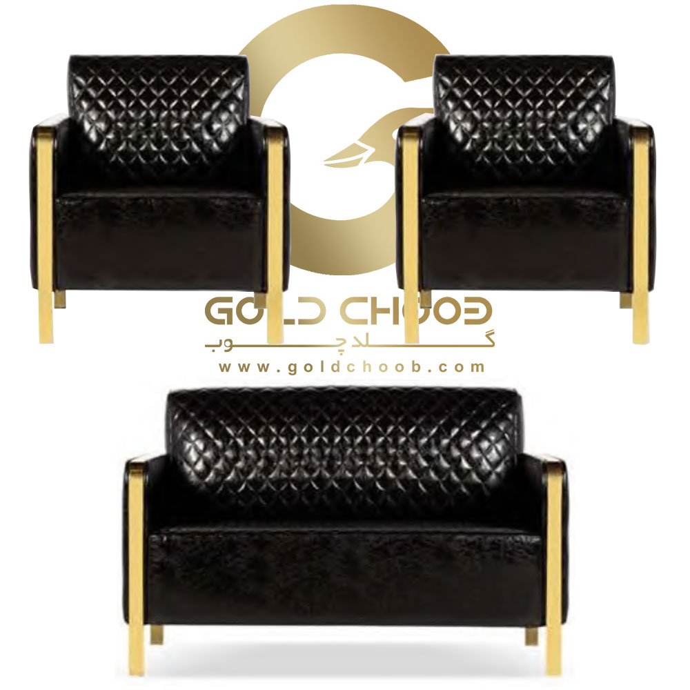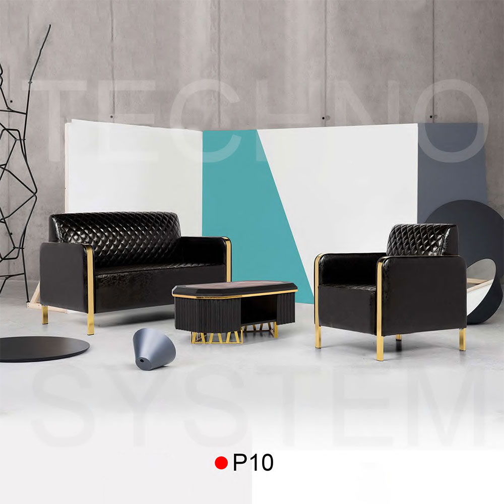 مبل اداری تکنو سیستم مدل پاندا P10 -مبل نیم ست 4 نفره – فریم داخلی از جنس چوب روسی پایههای فلزی و روکش چرم و پارچه – کف فوم سرد پایه فلز با روکش نیکل طلایی