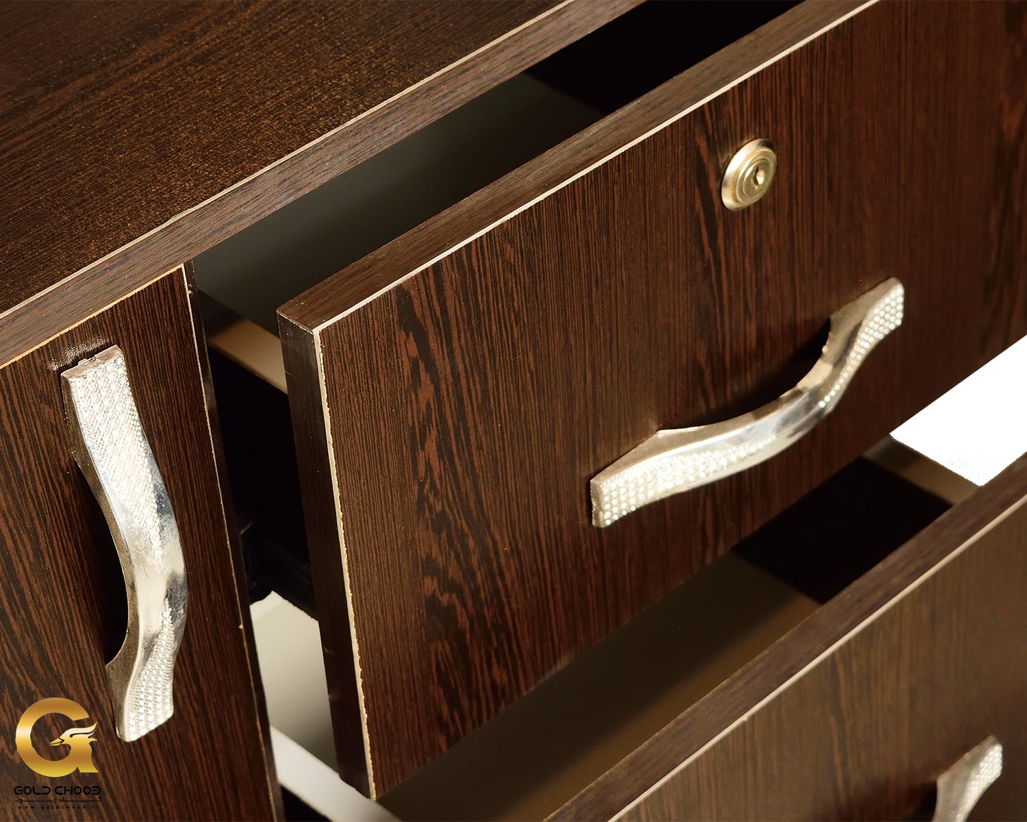 دارای ال متحرک با ابعاد 70×40 سانتی متر و ارتفاع 70 سانتی متر با 3 کشو و کمد می باشد، برای کشو از ریل دو تکه ساچمه ا ی استفاده شده است و همچنین لولای آرام بند درجه یک به کار رفته در کمد بر کیفیت آن افزوده است