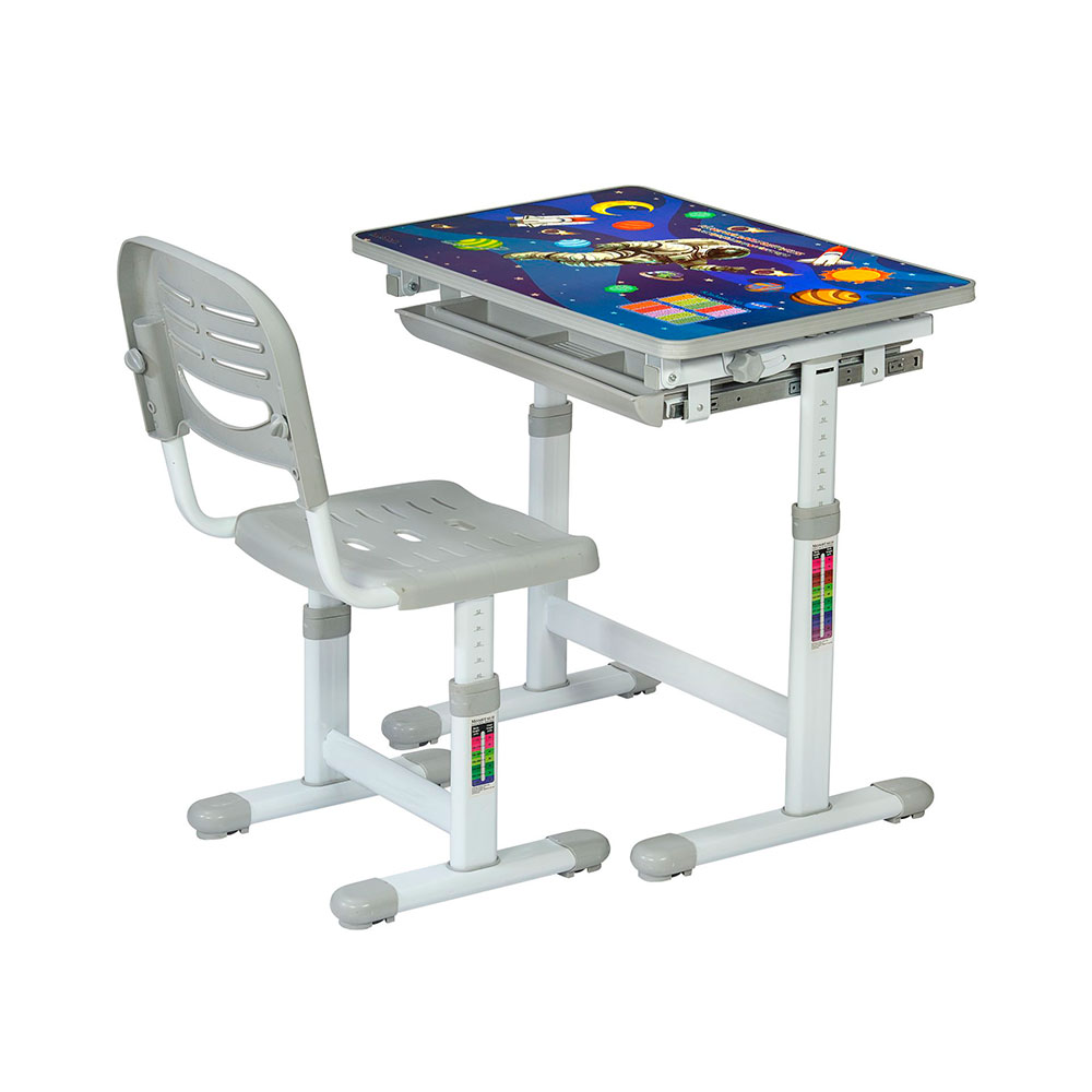 میز تحریر کودک قابل تنظیم ارتفاع طرح فضانورد طوسی رنگ که ارتفاع صندلی و میز بصورت دستی، بدون نیاز به باز و بسته کردن پیچ و مهره تنظیم میشود؛ تنظیم میز در 11 حالت با 22 سانتیمتر و صندلی در 6 حالت با 12 سانتیمتر است. شیب زاویه صفحه روی میز را نیز میتوان تا 40 درجه تنظیم کرد. این میز تحریر بچگانه دارای جاکتابی در زیر میز و محل آویز برای کیف بوده و جنس صفحه روی میز از ورق ملامینه ضدخش میباشد. جنس پایههای میز از آهن با رنگ کاری الکترواستاتیک کورهای است. از پلاستیک فشرده و محکم برای قسمت غیر فلزی صندلی استفاده شده است. در لبههای میز از PVC کار شده است. یک عدد آچار آلن برای سرهم و آماده استفاده کردن میز تحریر کودک درون بسته بندی آن وجود دارد.